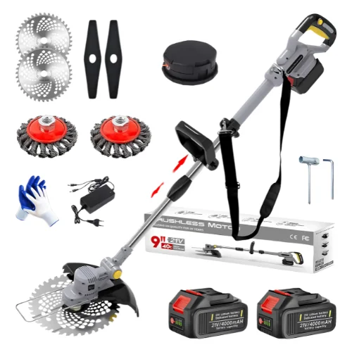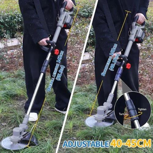 Leistungsstarker Rasenmäher mit bürstenlosem Motor, ausziehbarem Teleskopsystem (bis zu 2 m) und um 90° verstellbarem Kopf, schneidet Gras, Büsche und Äste einfach, praktisch und schnell.