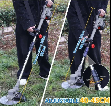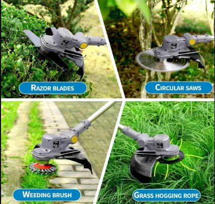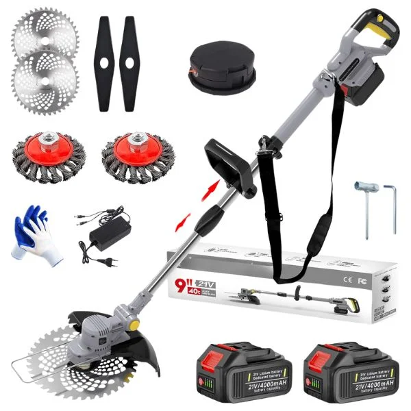 Oto akumulatorowa podkaszarka/trymer 4 w 1, wyposażona w różnorodne akcesoria, przeznaczona do różnych prac ogrodowych.