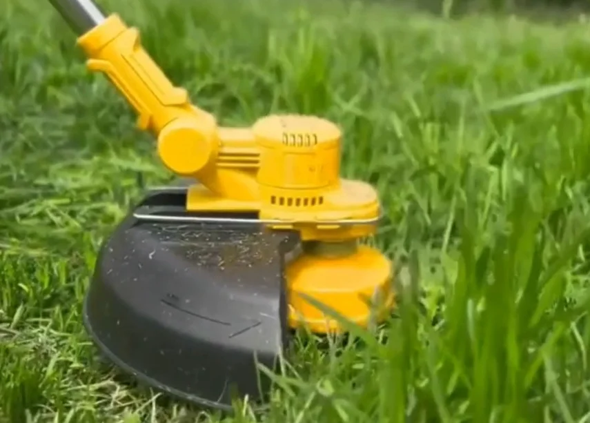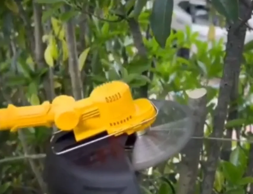 Zbliżenie żółtej bezprzewodowej kosiarki tnącej gałęzie i liście, demonstrujące jej działanie.